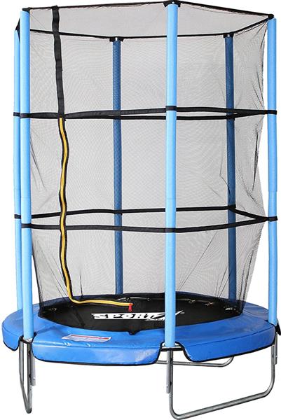 TAPPETO ELASTICO CM 140: struttura in acciaio verniciato a polvere, tappeto elastico made in USA impermeabile resistente ai raggi UV, rivestimento imbottito del telaio con rete di protezione della base per impedire ai bambini l'accesso sotto il tappeto. Rete di protezione anti cadute cm 124 h; sostegni della rete con rivestimento antishock. Ingresso con chiusura a zip.