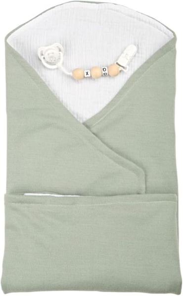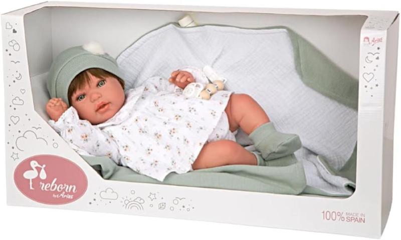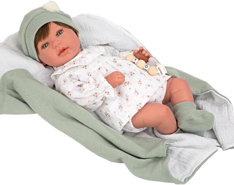 Bambola 45 cm con corpo morbido e capelli castani. Indossa un abitino bianco, cappellino e calzine verde salvia. Coperta inclusa.