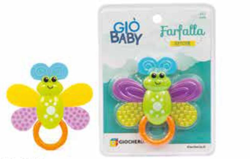 Colorata farfalla con impugnatura facile e parti in plastica morbida per dare sollievo nel periodo della dentizione.