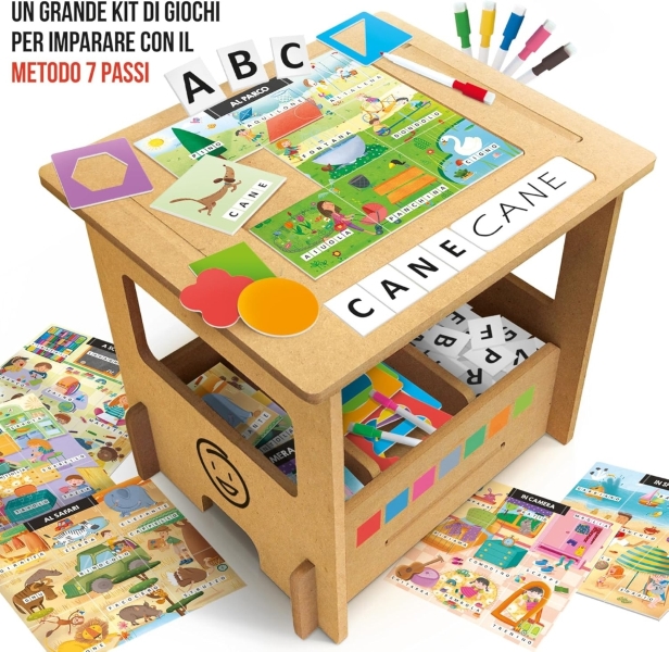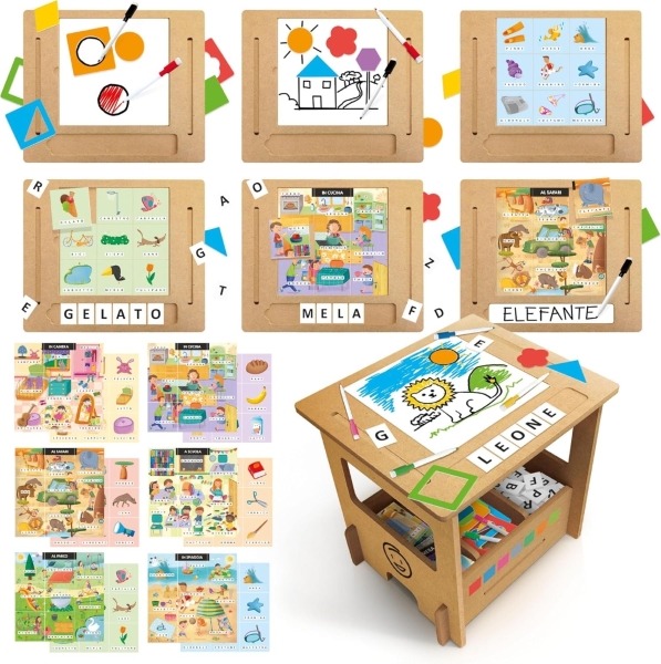 OTTIMI CONTENUTI per giocare in più modi e divertirsi imparando: Banchetto in legno; 6 puzzle-ambiente da 9 pezzi, 54 lettere mobili; 5 stencil delle forme; Una plancia per scrivere; Una lavagna; 6 pennarelli cancellabili; Guida didattica