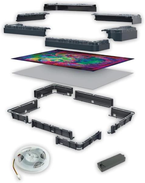 COSA CONTIENE: quadro interattivo contenente un puzzle da 520 pezzi (49x36 cm), cornice in plastica da assemblare, colla, poster guida, modulo elettronico con striscia LED RGB e istruzioni dettagliate per creare un quadro luminoso da esporre nella tua collezione dedicata alla serie