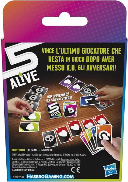 Preparati per un gioco di carte imprevedibile, super veloce e adatto a tutta la famiglia! Il gioco 5 Alive è una variante del classico gioco ""21"" in cui i giocatori ricevono carte numerate, ognuna con un valore nominale, e devono mantenere il totale al di sotto di 21 per rimanere in vita. Fai di tutto per sopravvivere! Assumiti rischi, intraprendi strategie e sabota gli avversari costringendoli a perdere vite! Se qualcuno supera 21, deve capovolgere una carta Alive. Una volta capovolte tutte e 5 le carte, è fuori dal gioco. I giocatori vengono eliminati fino a quando non rimane un solo vincitore! Segui le istruzioni sulle carte Jolly per colpire un avversario o rimanere in vita. Aggiungi un po' di adrenalina con la versione alternativa con morte improvvisa per una partita ancora più veloce, oppure gioca in squadre. Questo gioco è facile da imparare e veloce da giocare, quindi ideale per una serata di giochi in famiglia o per una festa improvvisata. Portalo con te per giocarci in viaggio. È un gioco divertente che i bambini e le bambine possono fare mentre sono in macchina o un'ottima attività da fare in casa per 2-6 giocatori, dagli 8 anni in su.