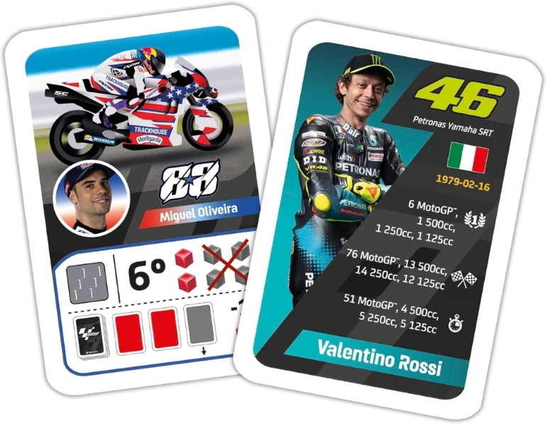 CONTENUTO DEL GIOCO: 12 moto, planche, carte piloti e azioni speciali, dado e regolamento. Le plance modulari permettono di ricreare fedelmente i circuiti a scelta tra 12 tracciati ufficiali della moto GP.
