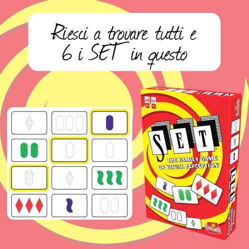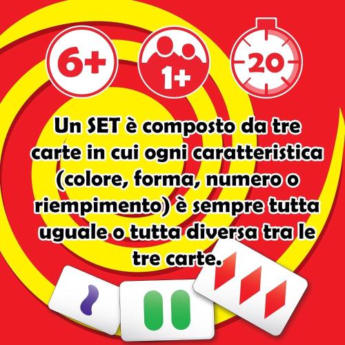 GIOCO DI RIFLESSIONE RAPIDA PER ADULTI E BAMBINI DAI 6 ANNI : SET è un gioco di carte visivo e strategico in cui ogni giocatore cerca di individuare combinazioni di carte chiamate "SET" in base a criteri visivi. Adatto ai bambini dai 6 anni, sviluppa la logica e la rapidità di analisi, coinvolgendo piccoli e grandi.