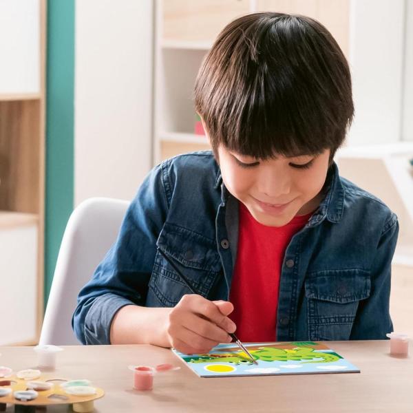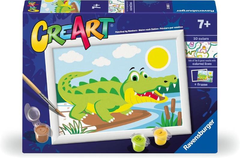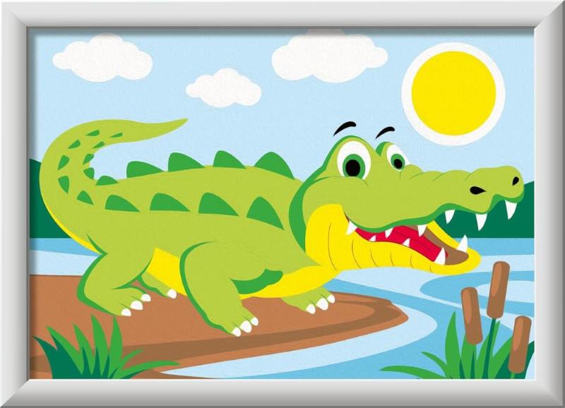 KIT DI PITTURA PER PICCOLI ARTISTI CON IL COCCODRILLO: il kit comprende la tavola prestampata, i colori acrilici a base d’acqua in vaschette richiudibili e un porta tempere; il pennello e la cornice sono inclusi