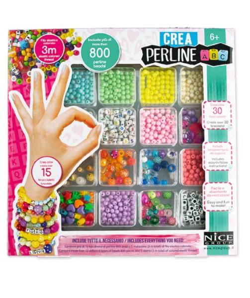 Confezione da più di 800 perline con pezzi speciali da combinare per creare braccialetti e collane fantasiosi ed originali. Contiene perline sferiche di 7 colori diversi, 3 tipi di perline ABC, stelle cuori e coroncine, e 5 vaschette di perline speciali assortite in diverse combinazioni di colori. Sono inclusi 3 metri di filo elastico con cui potrai realizzare i tuoi progetti. Fascia di età consigliata: 5-8 anni.