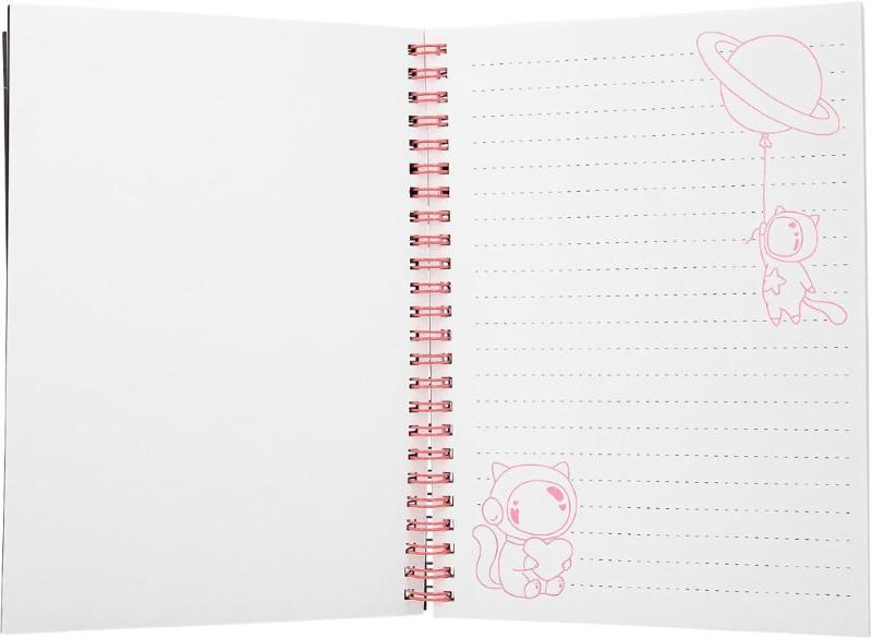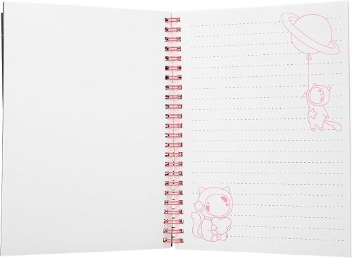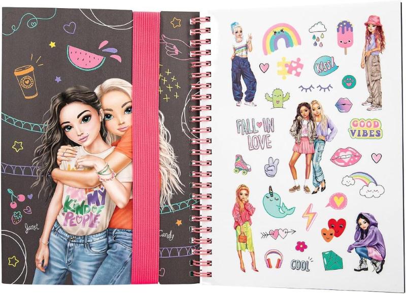 Libro di adesivi con rilegatura a spirale per girare facilmente le pagine e un ampio elastico a cui è fissata la tasca in rete