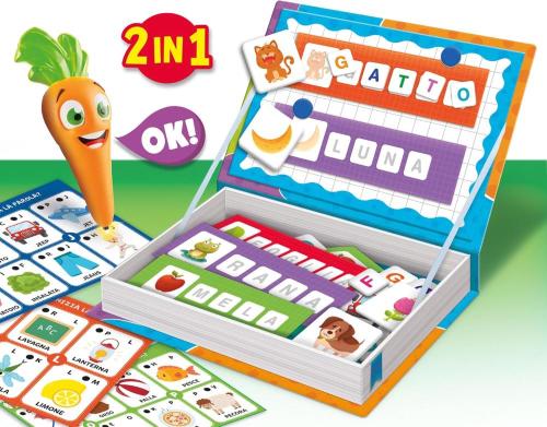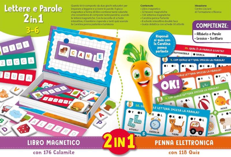 Libro magnetico, letterine magnetiche, penna parlante, cards magnetiche, schede attività, istruzioni