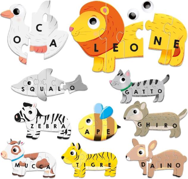 OTTIMI CONTENUTI per giocare in più modi e divertirsi imparando: 12 puzzle degli animali, 20 occhietti adesivi.