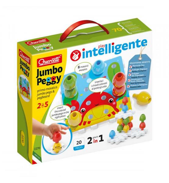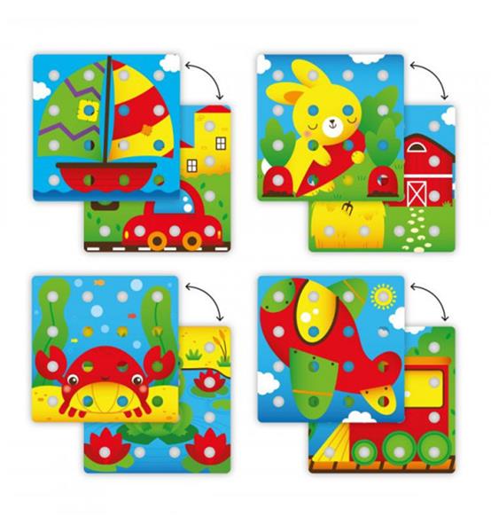 Primo approccio al gioco dei chiodini per i bimbi a partire dai 2 anni. 16 chiodi impilabili di grandi dimensioni, 4 piastre da incastrare e 4 schede illustrate da entrambi i lati su cui comporre mosaici colorati. Messe da parte le illustrazioni, le piastre e i chiodi si trasformano in un originale gioco di costruzioni, con cui sbizzarrirsi a realizzare altissime torri o qualsiasi altra struttura. Un ottimo gioco che sviluppa la motricità fine e la coordinazione occhio-mano.