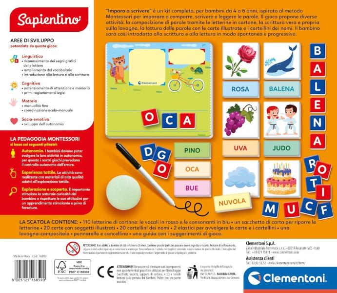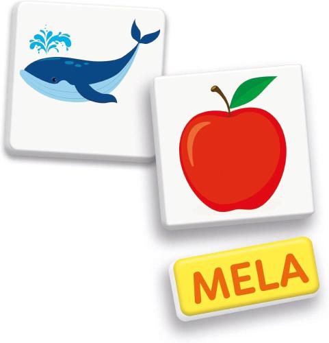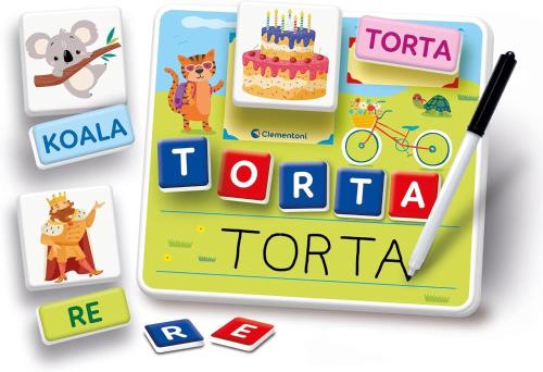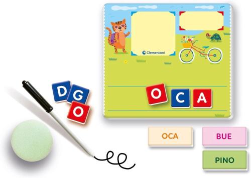 COSA CONTIENE: gioco educativo Made in Italy, adatto per bambini dai 4 ai 6 anni, include 110 letterine in cartone, 20 carte con soggetti illustrati e 20 cartellini dei nomi, una lavagna-compositoio, pennarello, cancellino e una guida con i suggerimenti di gioco