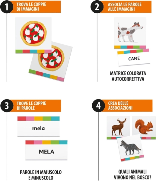 OTTIMI CONTENUTI per giocare in più modi e divertirsi imparando: 72 tessere, 72 tessere delle parole, istruzioni.
