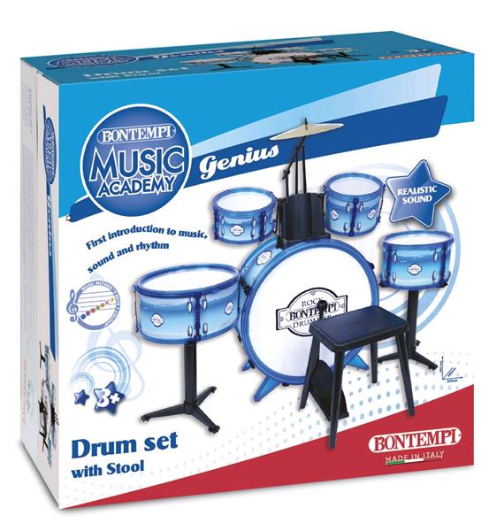 Batteria: grancassa Ø 385 mm con pedale • 2 tamburi Ø 170 mm • Tamburo da Ø 210 mm con supporto da terra • Rullante da Ø 236 mm con supporto da terra • Piatto metallico Ø 210 mm • 2 bacchette • Suoni realistici • Corredata di sgabello • Dim.: 850x650x680 mm