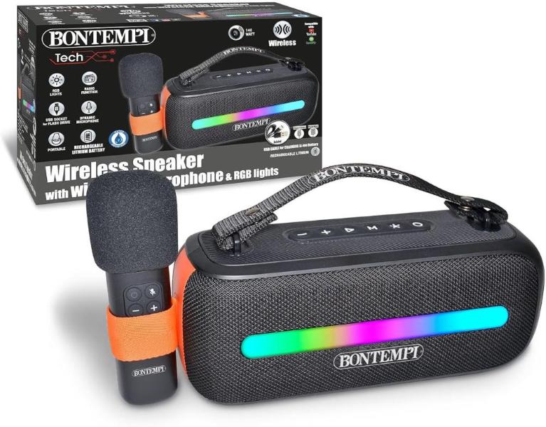 WIRELESS: L'amplificatore wireless permette di usarlo senza filo, il microfono è wireless e con luci RGB. Sia la cassa che il microfono sono resistenti all'acqua.