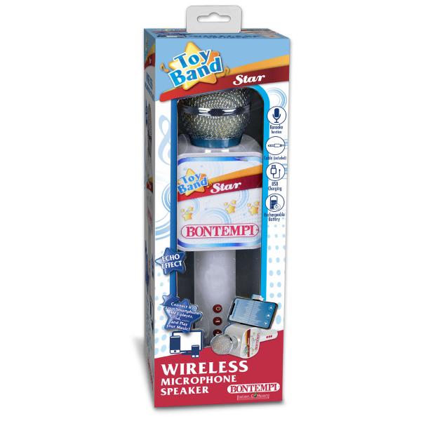 Microfono wireless con altoparlante • Effetto eco • Connessione Wireless (BT microphone) • Regolazione volume del brano in esecuzione • Tasti di selezione brano precedente/brano successivo • Supporto per smartphone • Presa micro USB per ricaricare la batteria al lithio attraverso il cavetto incluso • Autonomia: 3-4 ore • Tempo di carica: 1 ora • Dim.: 85x240x60 mm