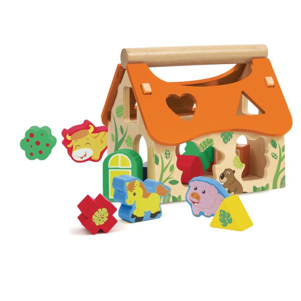 Una colorata casetta con 14 blocchi di colori e forme diverse. il tetto della casetta è apribile per facilitare l'estrazione delle formine inserite. La casetta è facilmente trasportabile grazie alla maniglia.