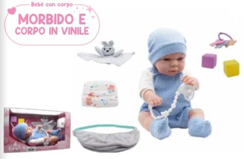 Bambola deluxe newborn in vinile morbido e realistico, indossa un completo azzurro, cappello e calzini coordinati. Avvolta in un elegante sacco bianco e azzurro. Dotata di pannolino, ciuccio e accessori.