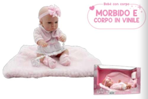 Bambola deluxe newborn in vinile morbido e realistico, indossa un vestitiono rosa e bianco, cardigan abbinato e fascia con fiocco. E' adagiata su una copertina rosa soffice, dotata di ciuccio e pannolino.