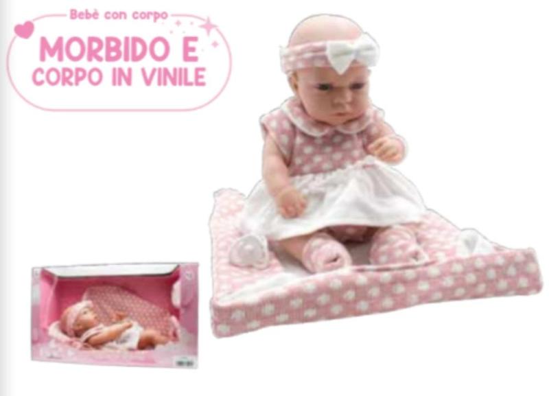 Bambola deluxe newborn in vinile morbido e realistico, con completo rosa a pois bianchi con colletto, fascia con fiocco e calzini coordinati. Abbinata con una copertina. Dotata di ciuccio e pannolino.