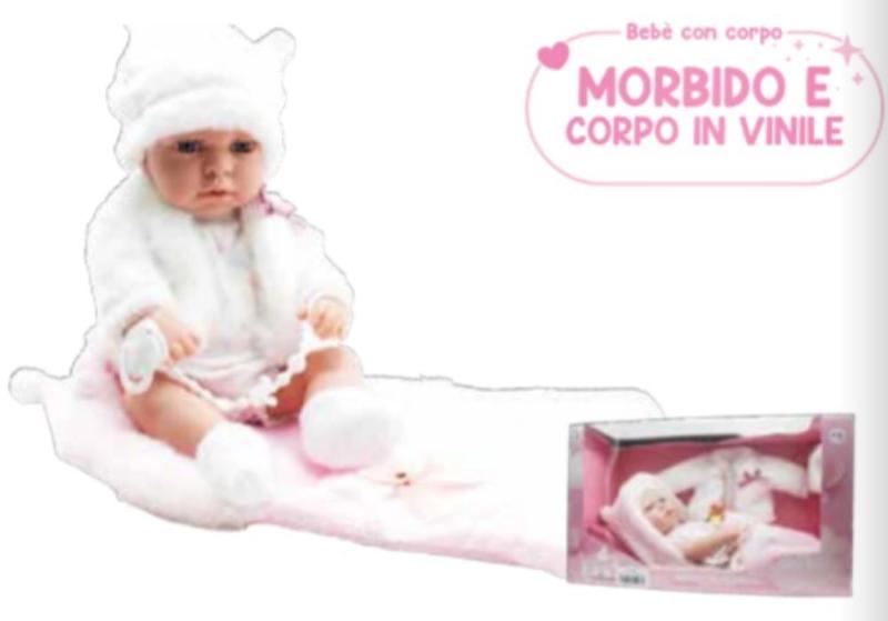 Bambola deluxe newborn con corpo in vinle morbido e dettagli realistici. Indossa una tutina con cuoricini, giacca peluche bianca con fiocco e cappello con orecchie. E' seduta su un plaid rosa e un fiocco in raso e pizzo, dotata di ciuccio e pannolino.