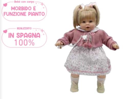 Bambola super realistica, testa e arti in vinile ed il corpo morbido e funzione pianto. Ha occhi e ciglia grandi e luminosi, le grinze tipiche alla pelle dei neonati, labbra lucide e piccole venature sulla fronte. Dimensioni e peso naturali ed include ciuccio.