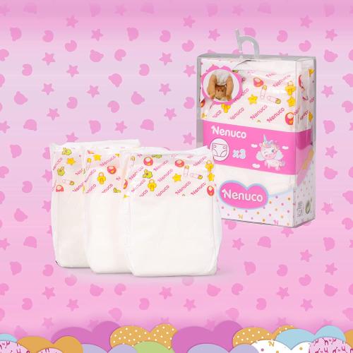 Include 3 pannolini riutilizzabili, per cambiare il pannolino della bambola Nenuco in qualsiasi momento e dove vuoi