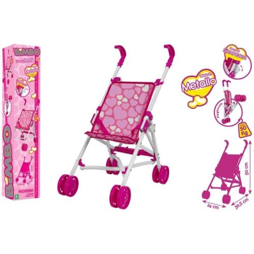 Romantico passeggino per bambole, dalla robusta struttura in metallo e rivestimento in stoffa dal design romantico.