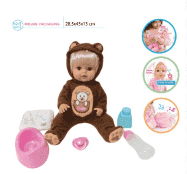 Bambola morbida dotata di tutina ad orsacchiotto, ciuccio interattivo, biberon, vasino per pipì e pannolino. Batterie 3x1,5V "AA" (non incluse).