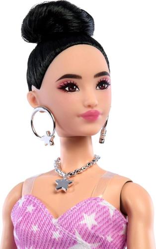 Questa Barbie ha un corpo atletico e porta i capelli neri raccolti in uno chignon alto. Il suo abito a tubino in denim senza spalline sfoggia una stampa a stelle e un grazioso dettaglio in vita.