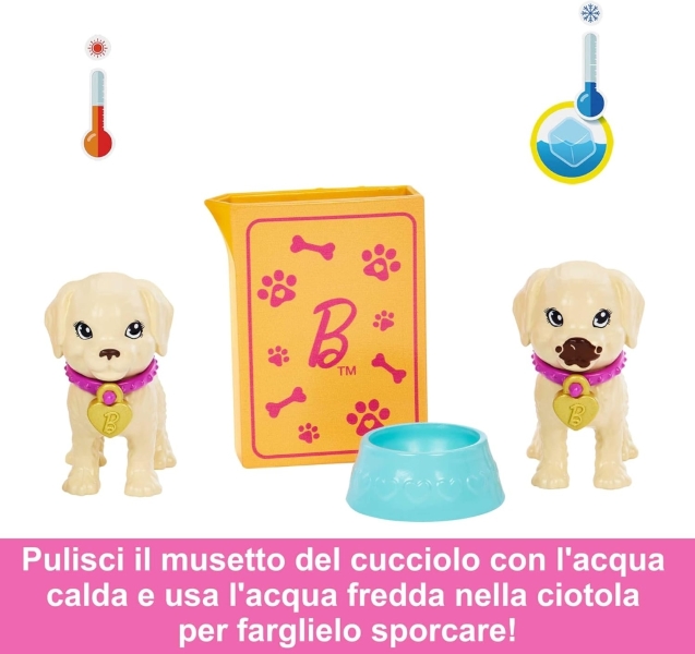 Il playset Barbie Cuccioli Adottati incoraggia a esprimere affetto e premure con la bambola Barbie, 2 cuccioli, accessori e l'effetto cambia colore.
