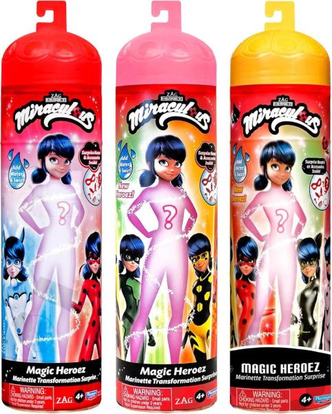 HIDDEN HEROEZ: Scopri i nuovi supereroi Miraculous con Marinette! Ogni bambola Magic Heroez Transformation ha uno speciale design super-tuta; aggiungi acqua per rivelare un eroe di volpe, coniglio o coccinella!