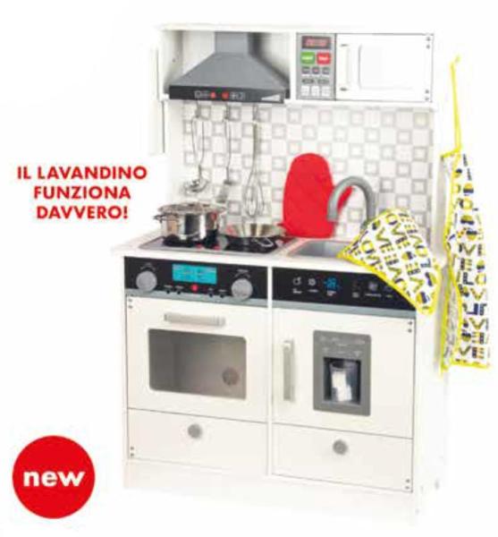 Cucina in legno elettronica con nove accessori inclusi, Lavandino con acqua funzionante.