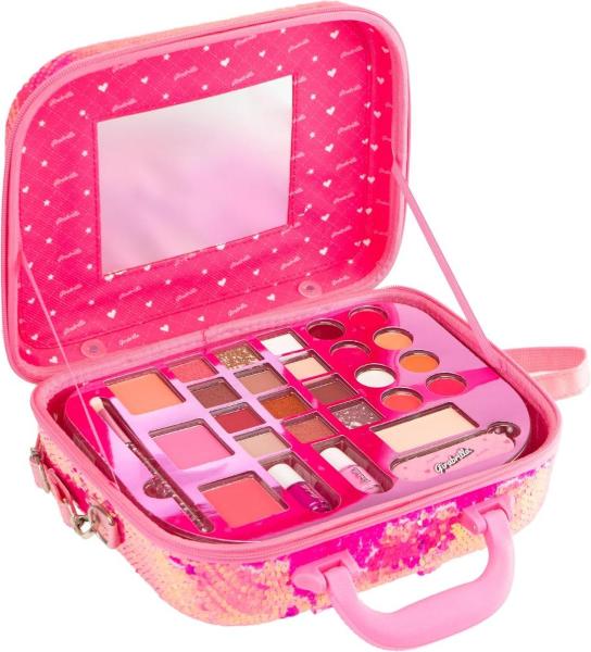 All'interno è presente un vassoio make-up con 12 ombretti, 8 lipgloss, 3 fard, 1 lucidalabbra in crema, 2 smalti, 1 separadita, 1 lima a forma di cuore, applicatori per trucco, adesivi per unghie.