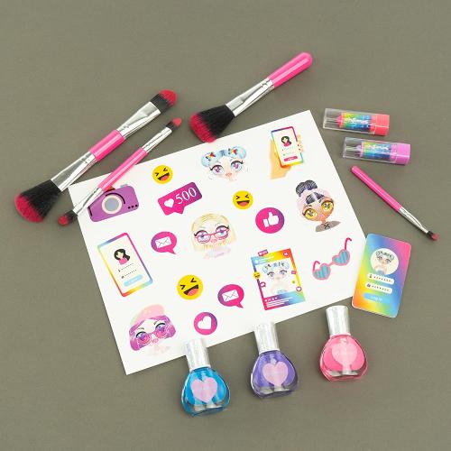 CONTENUTO: ombretti, lip gloss, fard, smalti, lima per unghie, lucidalabbra stick, applicatori, anello selfie ring, foglio istruzioni. Età consigliata: 6 +
