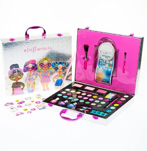 INFLUENCER SELFIE RING CASE: è una valigetta olografica scintillante, decorata con le immagini delle ragazze Influencer, che contiene un set di trucchi make up assortiti per bambine e un anello luminoso per scattare selfie perfetti.