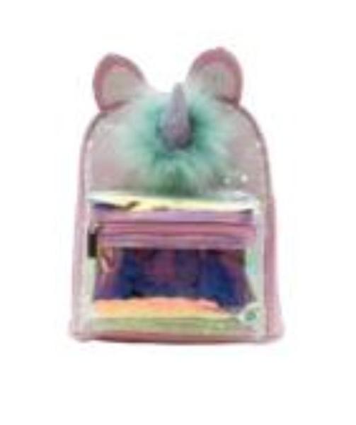 Zainetto rosa con orecchie glitter, corno da unicorno 3D e pon pon peloso. Decorato con fiori e ampia tasca frontale trasparente.