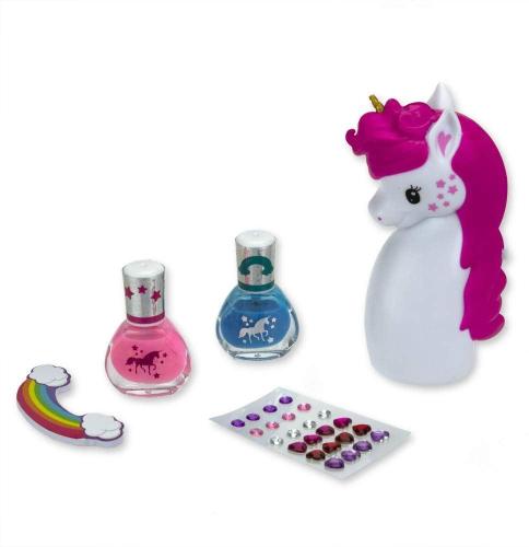Contiene 2 smalti a base di acqua, lima sagomata, gemme adesive, un asciugatore a forma di unicorno
