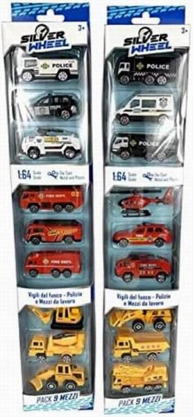 Silver Wheel - Pack 9 mezzi di cui 3 polizia, 3 vigili del fuoco e 3 mezzi da lavoro sc.1:64