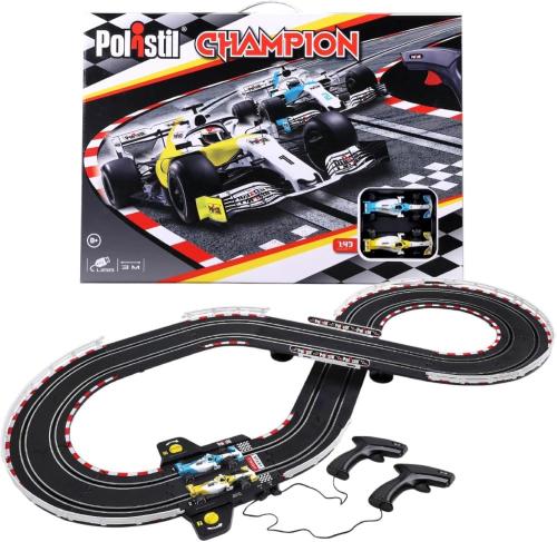 POLISTIL CHAMPION: Pista professionale lunga 3,08m con 2 slot car da corsa in scala 1:43, per sfide emozionanti e realistiche all’ultima curva grazie a un tracciato completo e avvincente.