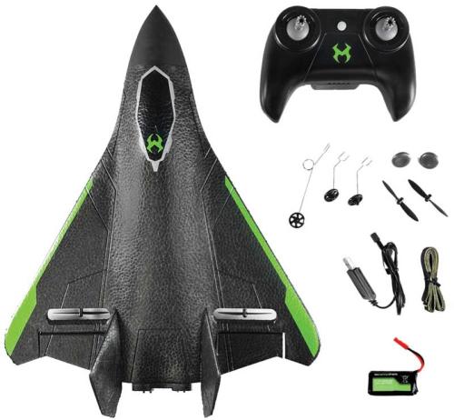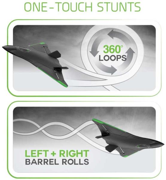 Jet con apertura alare di 33 cm e lungo circa 40 cm. Velivolo dalle velocità elevate. Può raggiungere i 40 Kmh. Tecnologia per un facile controllo. Nel radiocomando presente il pulsante "Stunt" per compiere acrobazie. Range di controllo del radiocomando progettato per grandi distanze. Struttura esterna del jet in gomma espansa per reggere agli urti. Batteria LiPo ricaricabile.