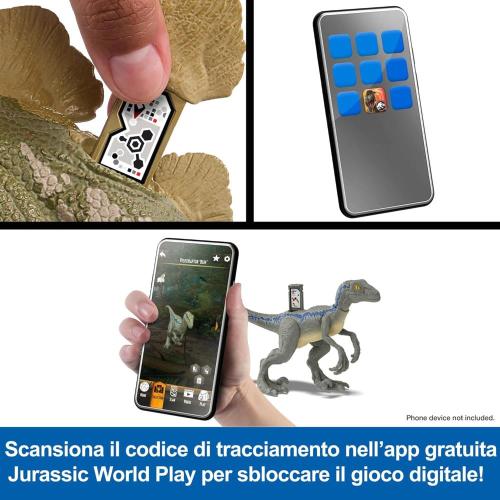 Giochi e dinosauri digitali! Scansiona il codice di tracciamento nascosto nell'app gratuita Jurassic World Play con un dispositivo smart compatibile (non incluso) per collezionare il dinosauro digitale e giocare a divertentissimi giochi!