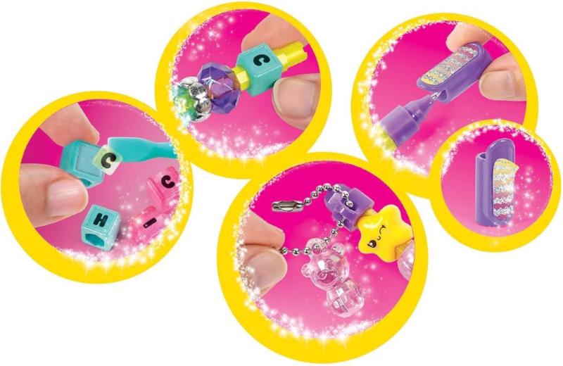 COSA CONTIENE: gioco per bambine e bambini da 6 anni in su con base e strumento di infilatura, 8 penne personalizzabili, 12 ricariche in 6 colori, pinzette, perline con lettere e forme, charms con catenelle, adesivi decorativi, schede guida e manuale
