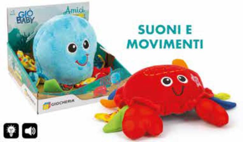 SIMPATICI PELUCHE CON SUONI E MOVIMENTO.DISPONIBILE GRANCHIETTO ROSSO O POLIPETTO AZZURRO.