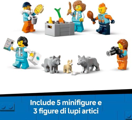 Gioco di ruolo ricco di dettagli: il set include un camion LEGO da esplorazione, una motoslitta giocattolo, una scena con grotta artica, le minifigure di un autista, un fotografo, uno scienziato, un medico, un meccanico, e 3 lupi artici