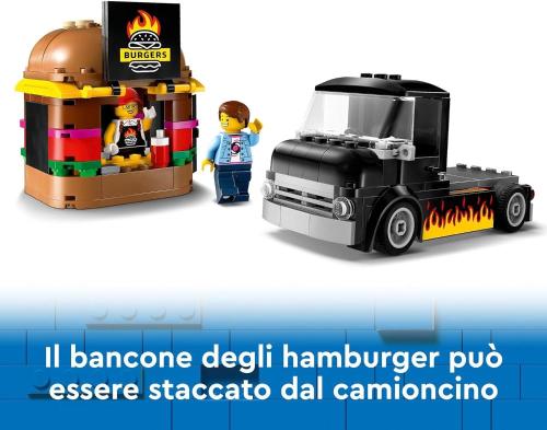 Food truck giocattolo: servire al fast food è un gioco da ragazzi, con il set giocattolo Furgone degli Hamburger LEGO City da costruire, per bambini e bambine da 5 anni in su