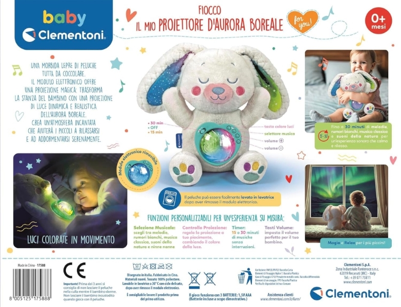 COSA CONTIENE: peluche ideato, progettato e sviluppato in Italia, per bambine e bambini dai 0 mesi in su, con batterie incluse per un gioco immediato e senza interruzioni