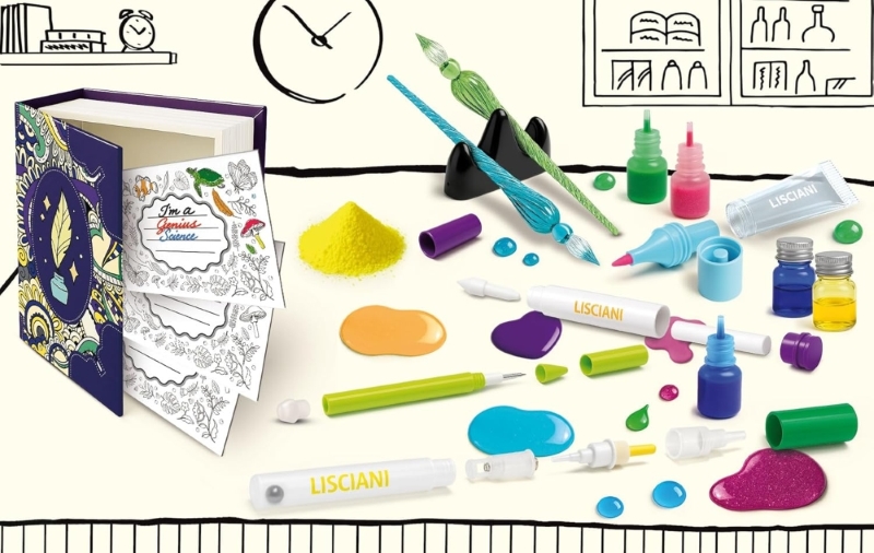 - 2 penne stilografiche- poggia penna- penna cancellabile- penne a sfera-pennarello - inchiostri colorati- inchiostri glitter- inchiostro profumato- scatola a libro- manuale illustrato
