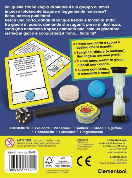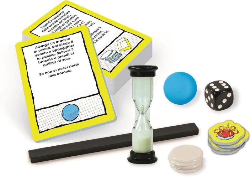 COSA CONTIENE: gioco Made in Italy in lingua italiana, per 2-6 giocatori da 10 anni in su; la confezione contiene 198 carte, 20 corone, 1 pallina, 1 dado, 5 gettoni, 1 bacchetta, 1 clessidra, 1 regolamento