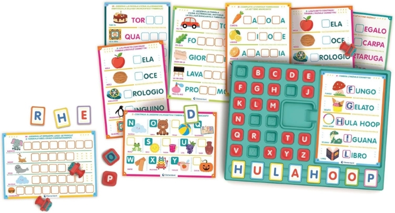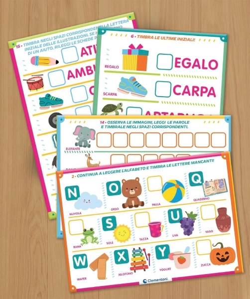COSA CONTIENE: gioco educativo Made in Italy per bambini dai 4 ai 6 anni, contiene 8 schede con 16 attività, 26 timbri lettere, 32 tessere in cartone con lettere fronte/retro, tampone con inchiostro, banchetto attività e guida con suggerimenti di gioco
