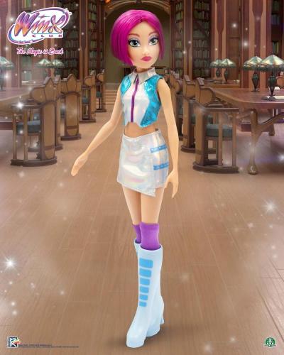 Tecna Originale - Tecna indossa il suo outfit ufficiale: top corto con zip, minigonna metallizzata e stivali alti coordinati. Un look moderno e tech-inspired, perfetto per la fata della Tecnologia più logica e ingegnosa del Winx Club.